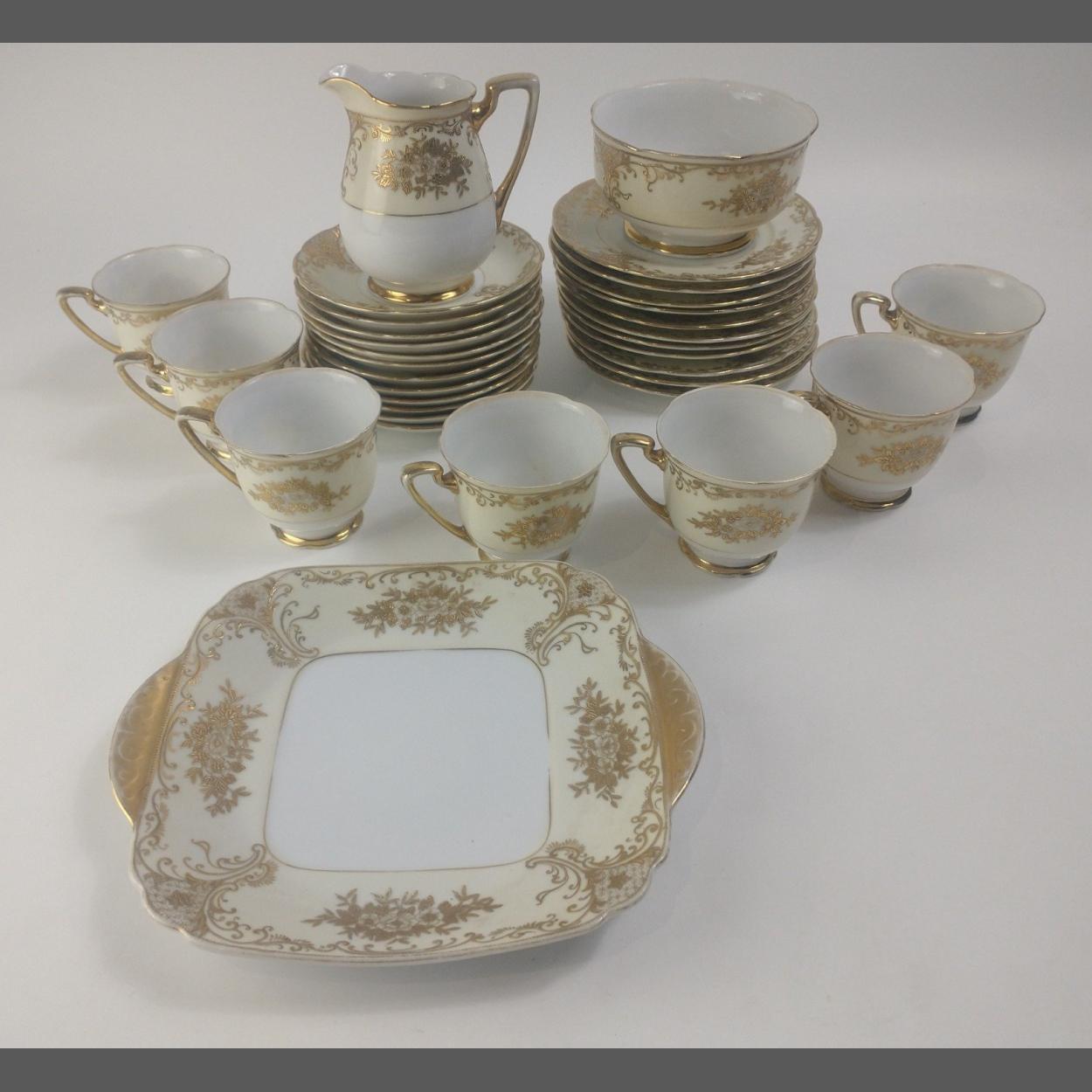 A MEITO hand-painted tea service to include 7 cups, 13 saucers, 11 side plates, 1 sandwich plate 20cm, 1milk jug, 1 sugar bowl