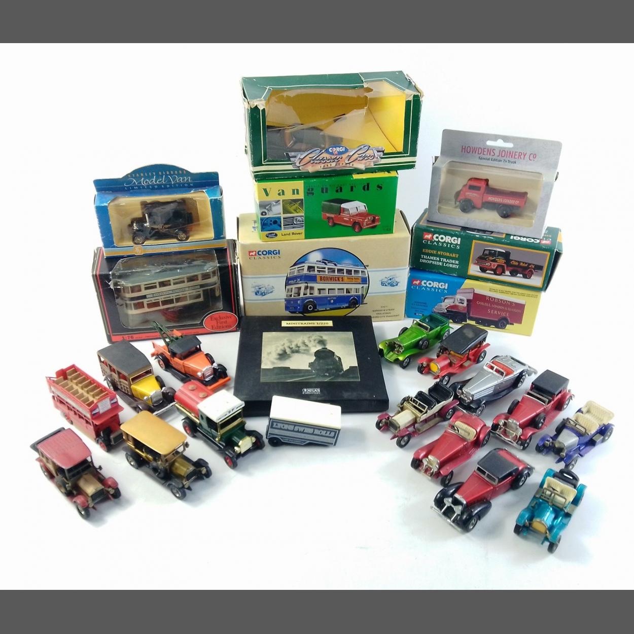 A box containing a good lot of DIECAST MODELS to include CORGI CLASSICS 97871 Trolleybus in box, Vanguards LAND ROVER in box and others of interest.