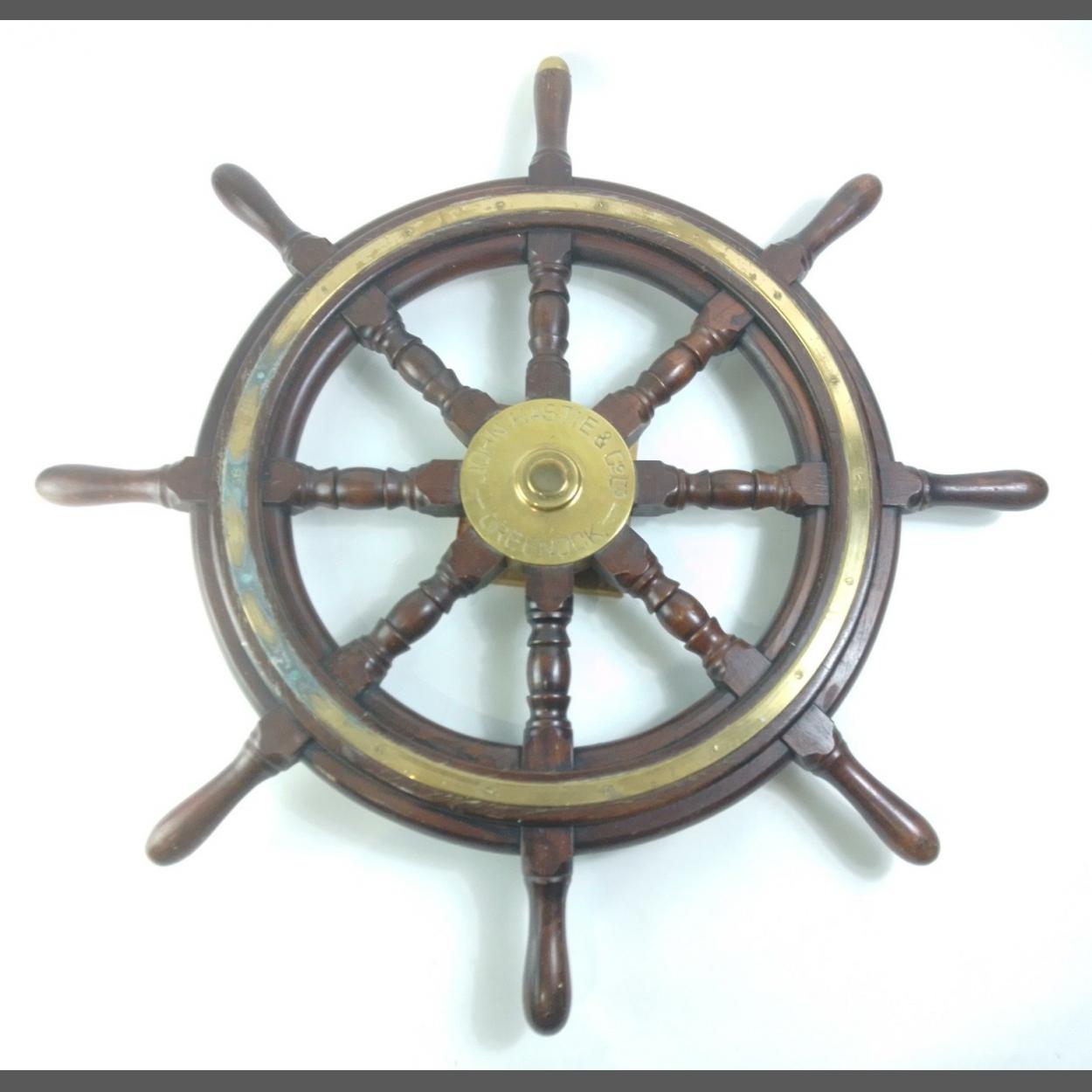 A superb original ship's wheel, 60cm diameter by JOHN HASTIE & CO of GREENOCK. This wheel was salvaged from HMS Rothesay, a Royal Navy anti-submarine frigate. Scrapped in 1988.