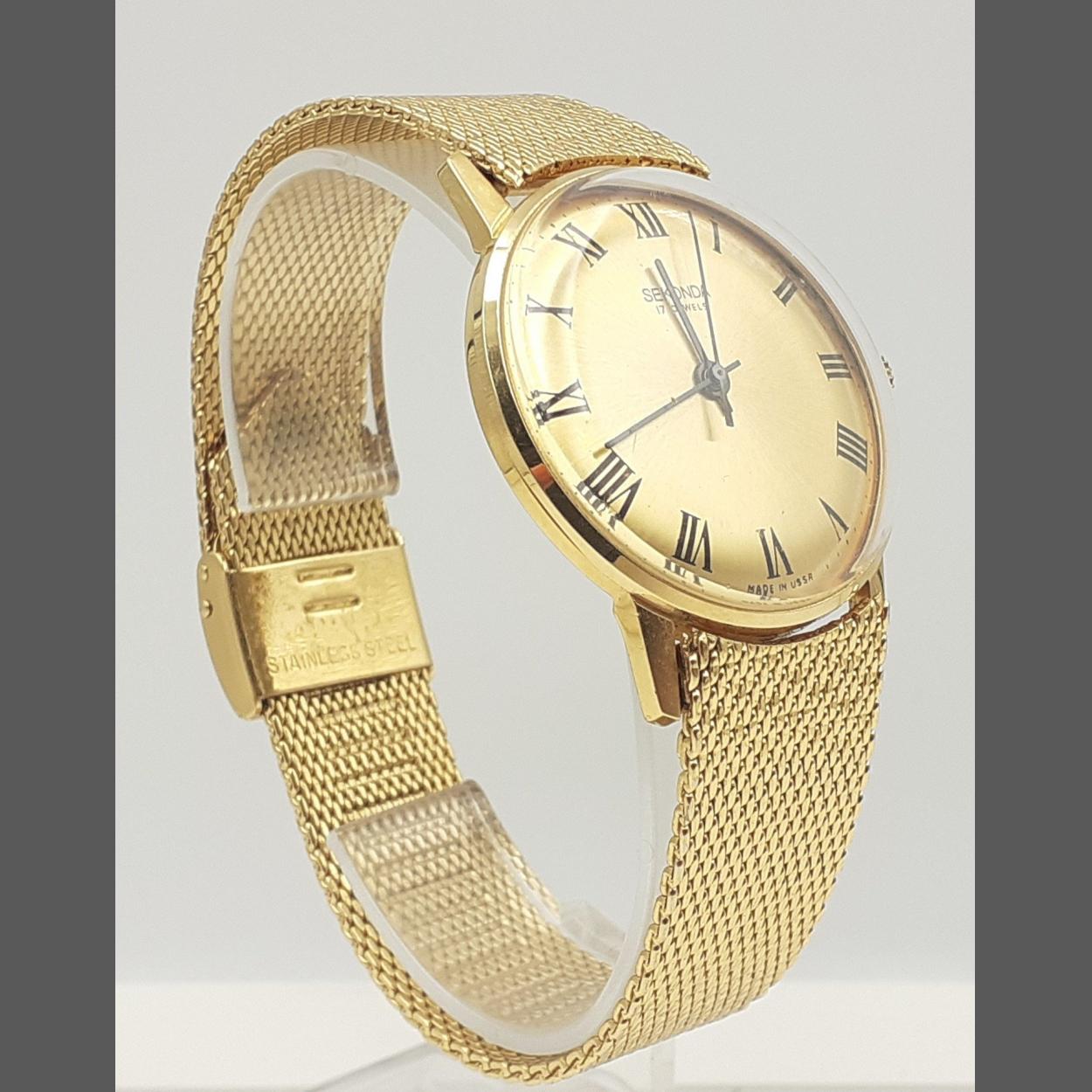 A SEKONDA gentleman's watch 17 jewels, dial 30mm approx. Gold face with gilt bracelet. In working order.