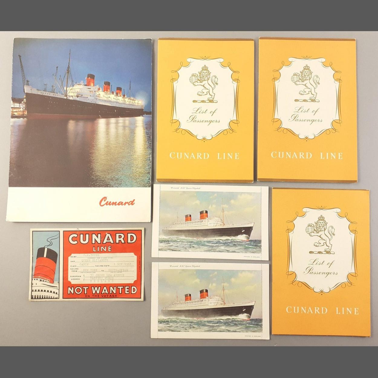 A small collection of ephemera from the CUNARD LINE's Queen Mary and Queen Elizabeth to include gala dinner, menu, passenger list, luggage label etc