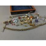 A small wooden box with contents to include ROTARY INTERNATIONAL pins, cufflinks, tiepins etc