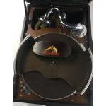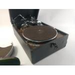 A wonderful HMV vintage portable wind up Gramaphone. Appears to be in remarkably good order even having the original branded disc cleaning brush. Case size 41cm x 28cm x 16cm.