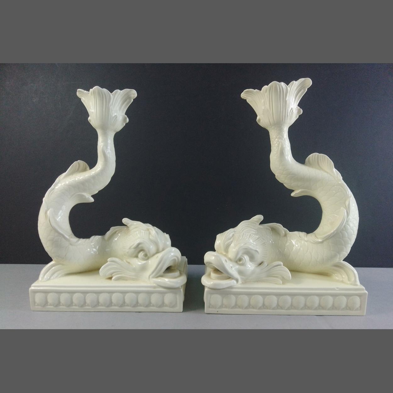 A pair of WEDGWOOD white porcelain Dolphin Candlesticks. W17 x H24cm approx. A wonderfully sculpted pair that display well. One with older historical repair