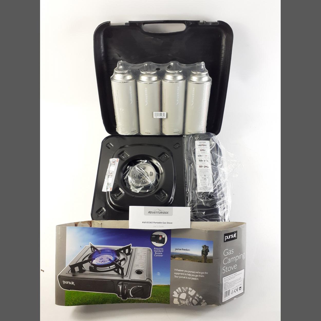 A PURSUIT gas camping stove including storage case with four cans of butane gas