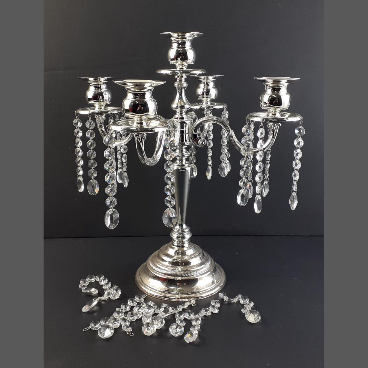 A stunning addition to the Christmas table - a glitzy 4 branch candelabra with glittering drop glass drops. Stands 35cm high