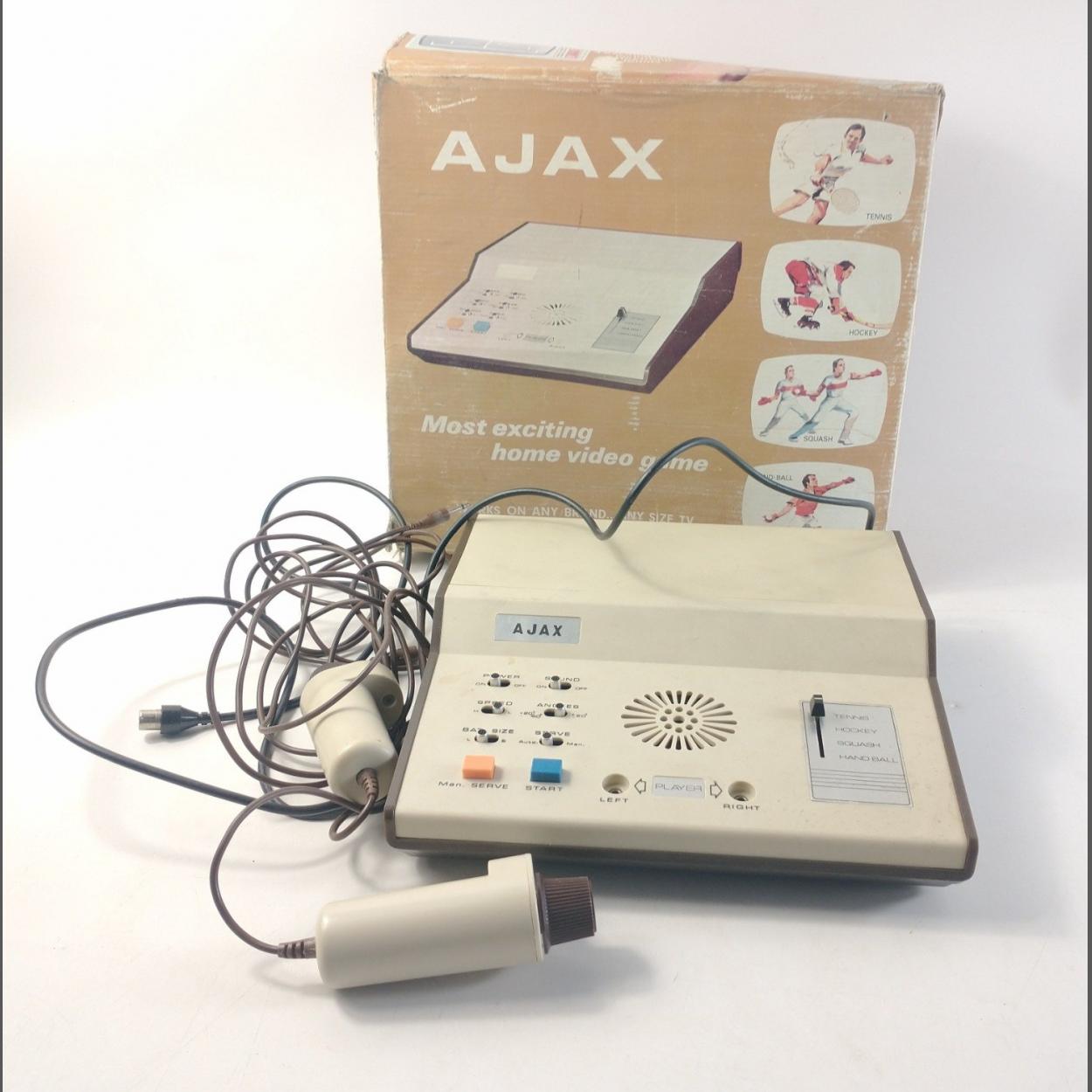 A vintage AJAX home video game with 2 controllers. In box with wear. Untested.