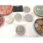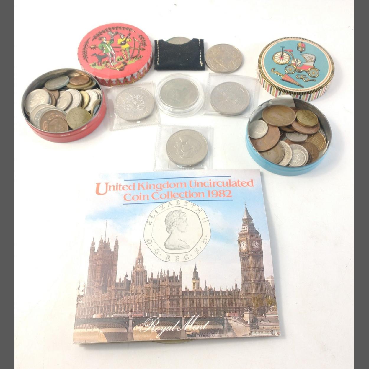 A collection of coins of interest to include UK 1982 coin set, various Crowns, and 2 tins containing UK and world coins of interest.