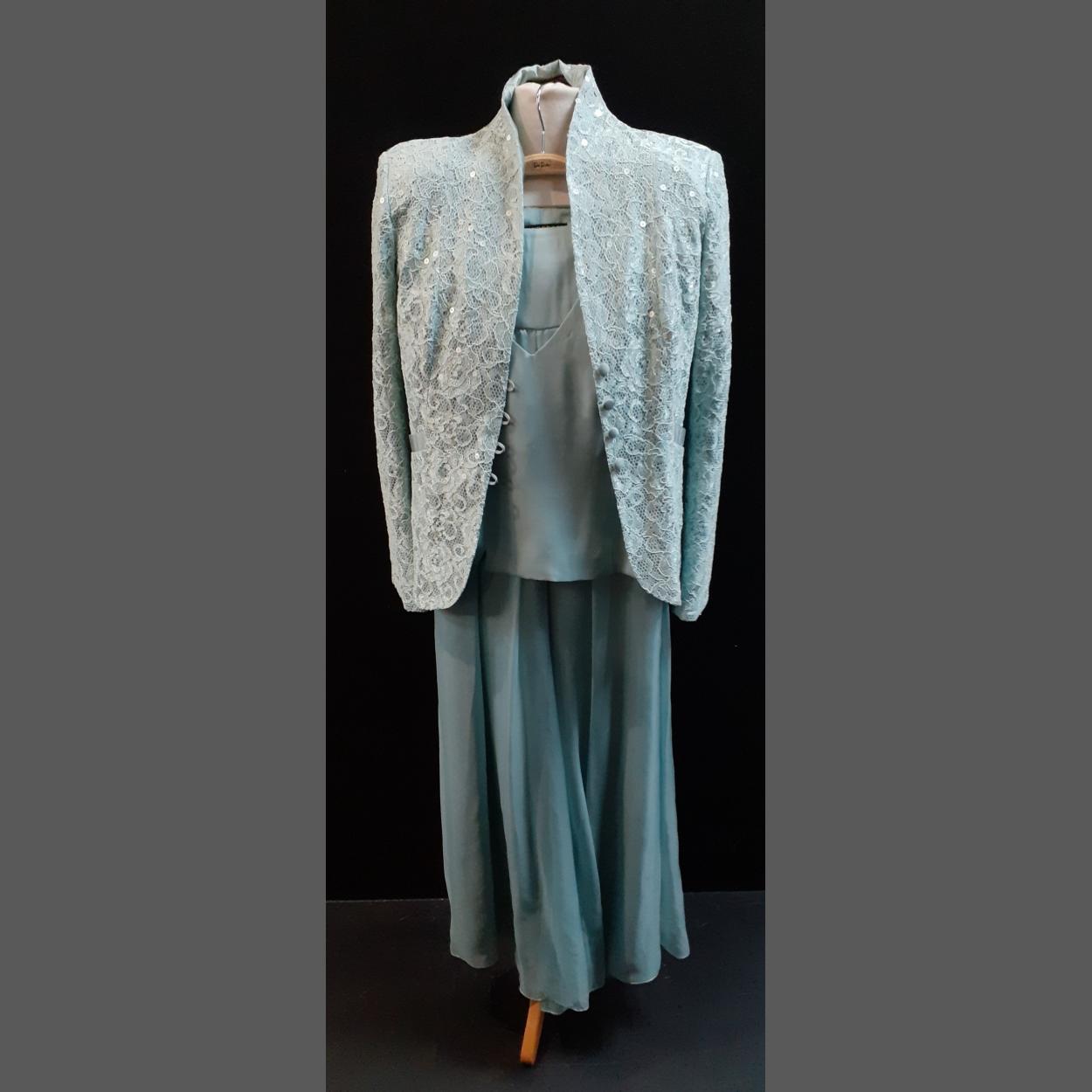 Look like Royalty in this FAVOURBROOK 3 piece 100% silk suit in a lovely sage green colour. Size 14 sleeveless top, silky lined trousers and a jacket. Plus small matching clutch bag. Perfect for a wedding.