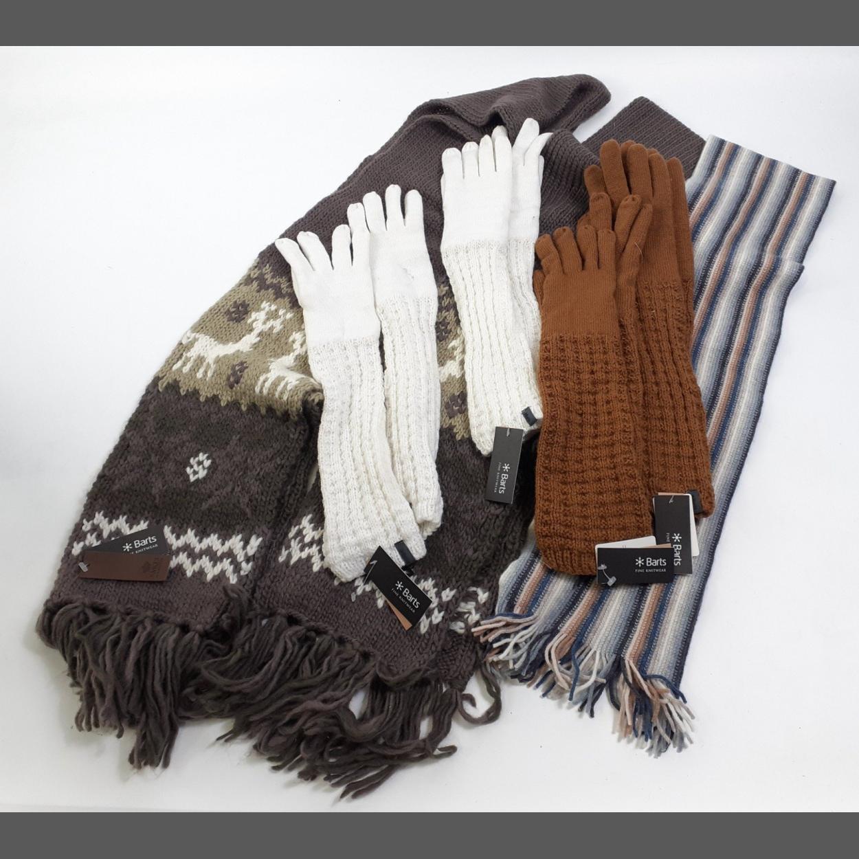 Dress for the weather with long hand-knitted gloves by BARTS, two in camel and 2 cream, an ALAN SANTRY grey striped scarf, and 2 BARTS Alaska misty brown scarves,