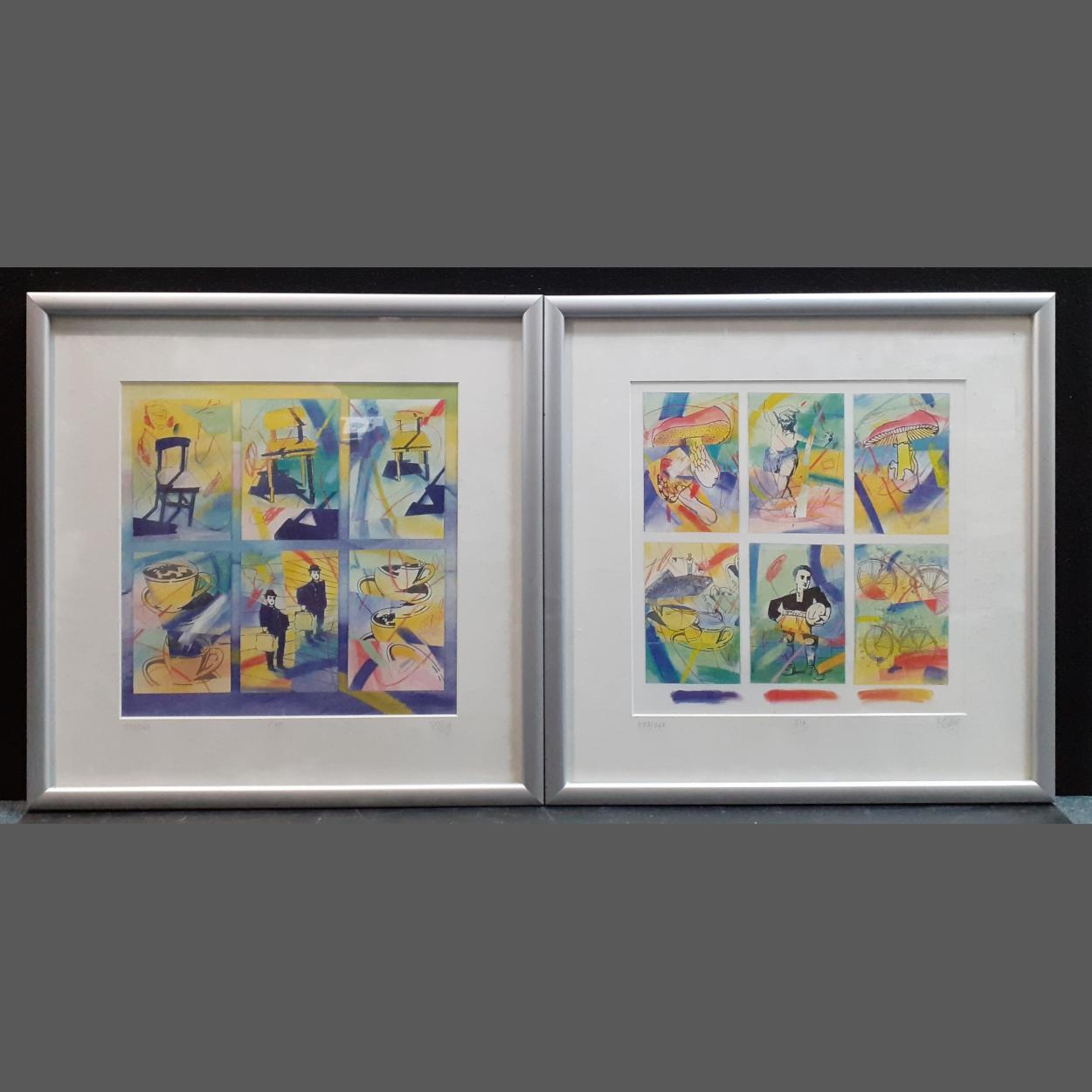 Two limited edition pop art prints by BERND FLEMMING one titled CUP (306/560) and the other entitled SIX (97/560). Frame size 85 x 84cm approx