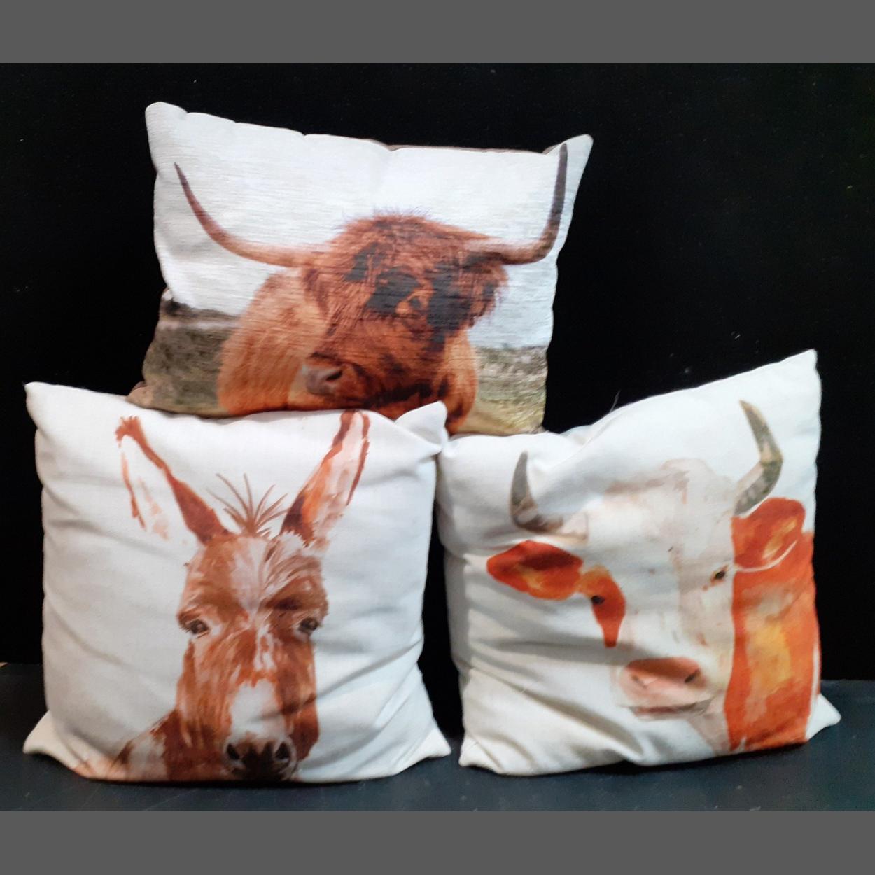 XMAS GIFTING IDEAS! - Three cushions one donkey and 2 Highland cows.