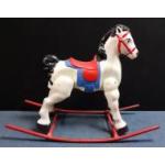 A circa 1950s vintage lovely old metal children's rocking horse H80xL100cm approx, missing one handle grip.