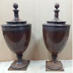 A pair of early 19th century SHERATON style urn-shaped mahogany knife/spoon box, the lid with acorn finial supported by a central post and the interior designed with tiered fittings, raised on a square base.