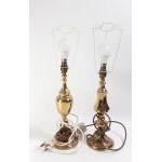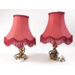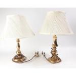 A pair of small brass lamps with red shades, with also 4 other brass effect table lamps with shades - 50cm approx tallest to the top of the light-bulb
