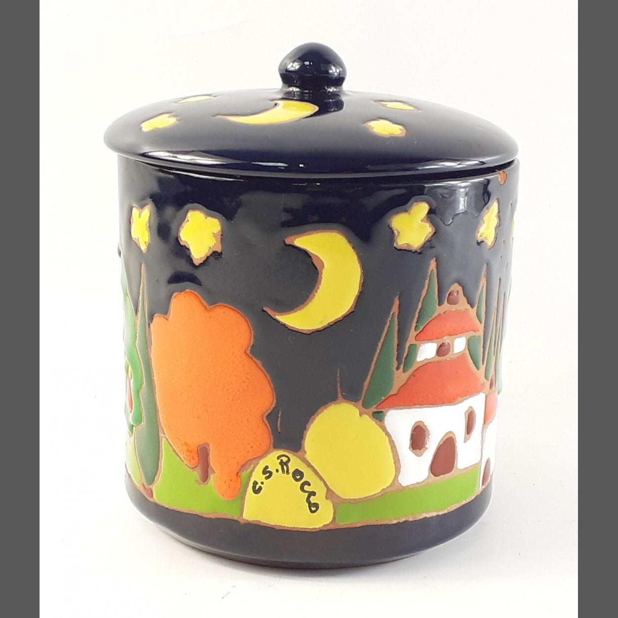 Beautiful Italian ceramic studio pottery sugar bowl / jar in good used condition (nibbles noted to rim), Signed C.S. ROCCO. Stands 13cm approx.