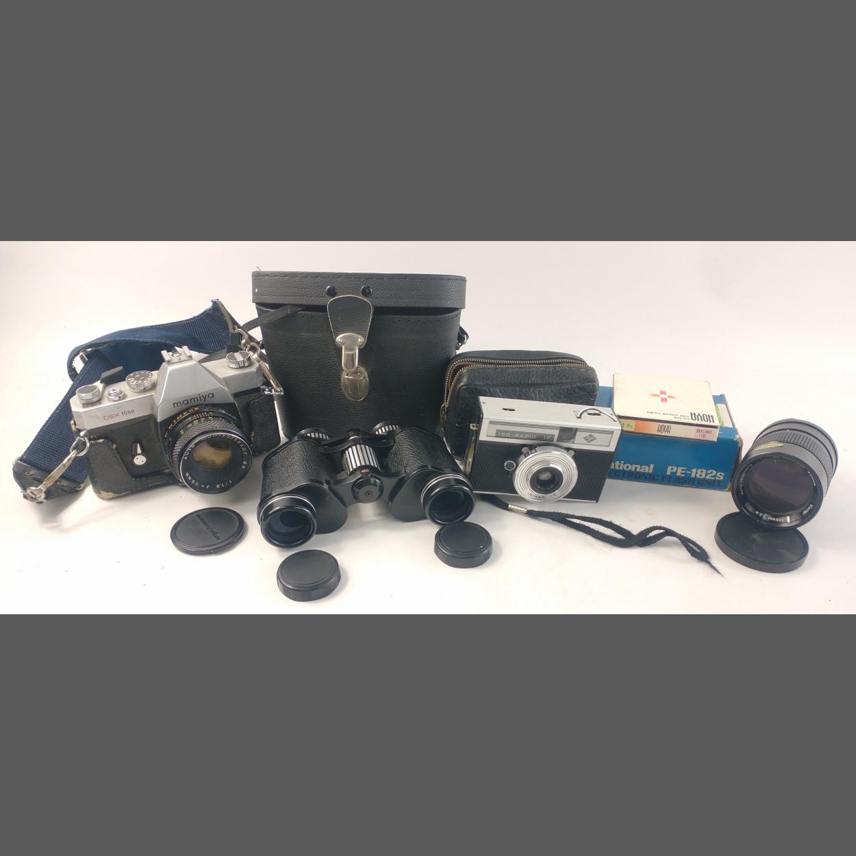 A box containing a MAMIYA DSX1000 camera with fitted 1:1.8 lens and a VIVITAR 55ml lens camera and a pair of Boots binoculars 8x 30