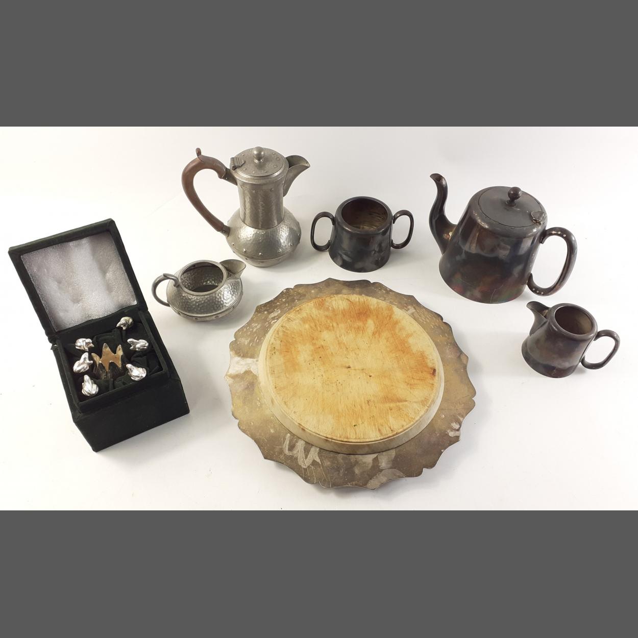 A small metalware lot to include an intriguing presentation box with 6 frogs on spikes and an open lotus leaf, also a wooden cheeseboard 20cm approx with EP surround and pewter teapots and milk jugs.