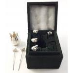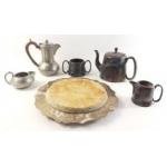 A small metalware lot to include an intriguing presentation box with 6 frogs on spikes and an open lotus leaf, also a wooden cheeseboard 20cm approx with EP surround and pewter teapots and milk jugs.