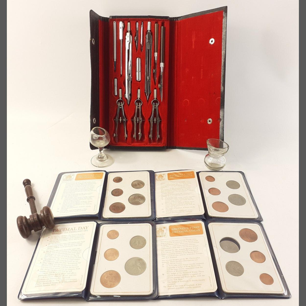 An unusual little mixed lot with items of interest to include small gavel, two glass eye baths, a nice complete set of draughtsman's drawing set and four sets of Britain's first decimal coins.