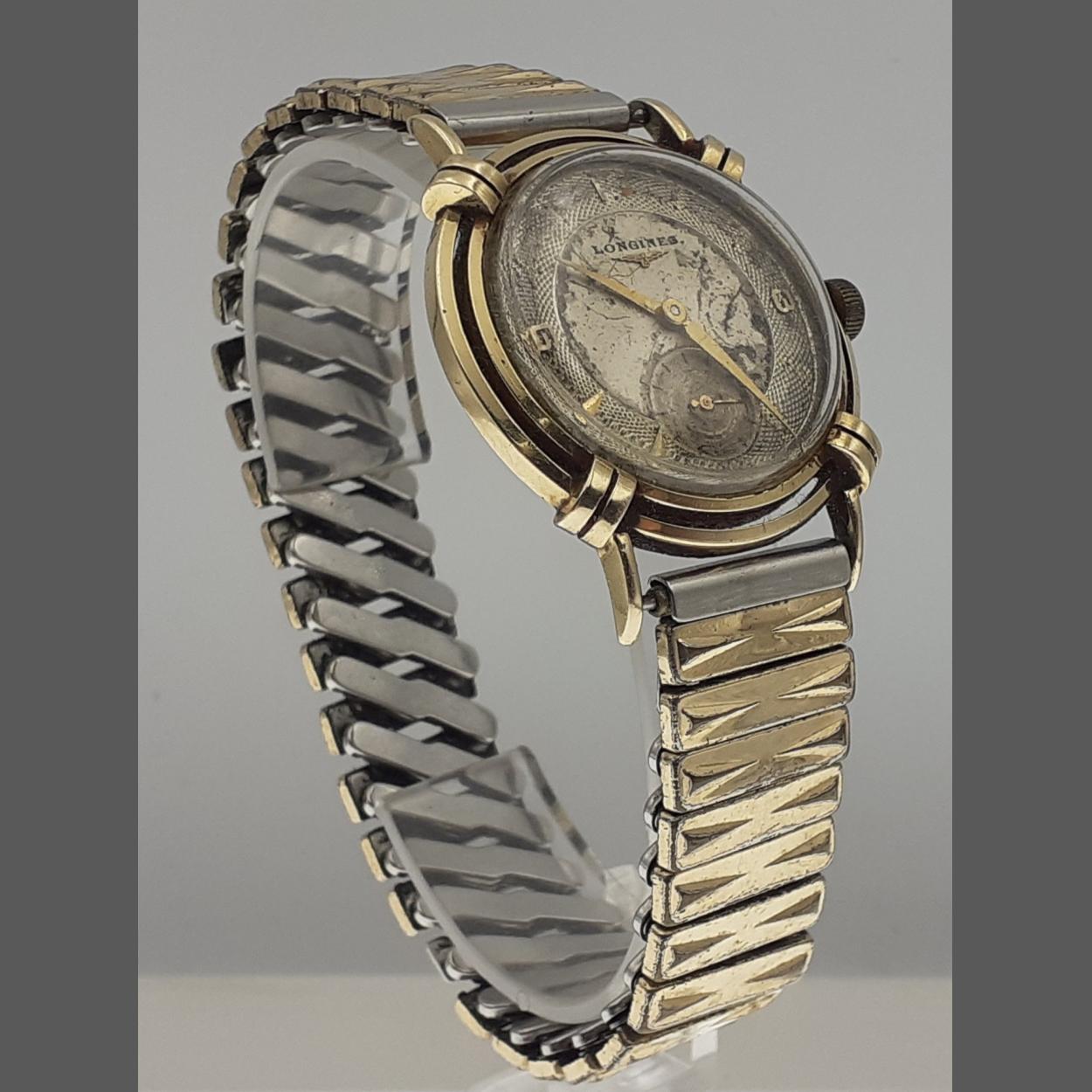 A LONGINES gent's wristwatch with 14K gold stamped back case. Appears to run with a gentle wind but face scratched. 17 Jewels movement and expandable steel bracelet. Case back marked Longines Wittnauer K&E 4K Case back weighs 4.3g approx. Face 24mm approx.