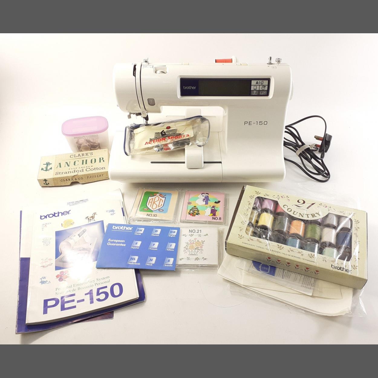 BROTHER PE-150 Personal Embroidery System complete with instructions, three electronic embroidery cards, accessories and threads. Powers up and in well cared, well stored condition, only ever lightly used prior to being carefully stored away. A perfect machine for entering the world of embroidery.