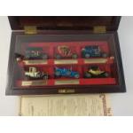 A wooden display case with 6 limited edition MATCHBOX Models of Yesteryear connoisseurs collection including 1911 Model T Ford, 1909 Opel, 1911 Daimler, 1910 Benz limousine, 1912 Packard Landaulet and a 1911 Maxwell model gar roadster. Box measures 35 x 20 x 8cm approx