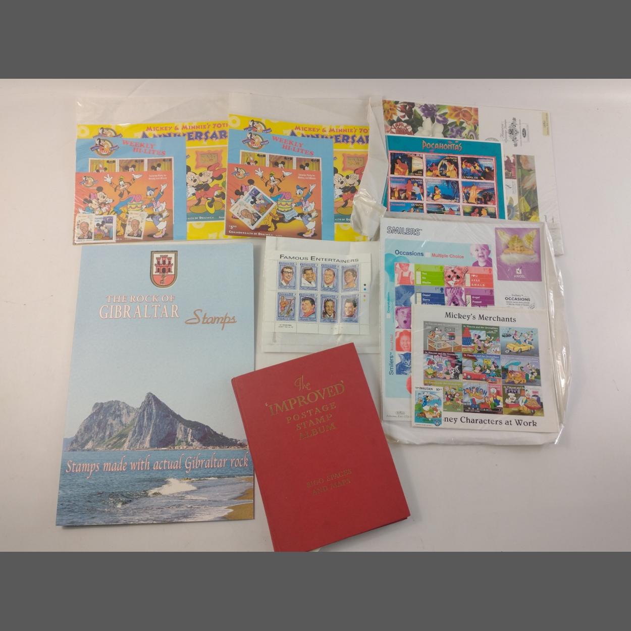 A child's stamp collection to include DISNEY characters, Rock of Gibraltar, flowers, plus an album of stamps from around the world.