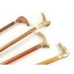 A collection of four wooden walking sticks, one with a brass horse head, a three-piece brass horse head and one with a carved horse head, longest 90cm approx