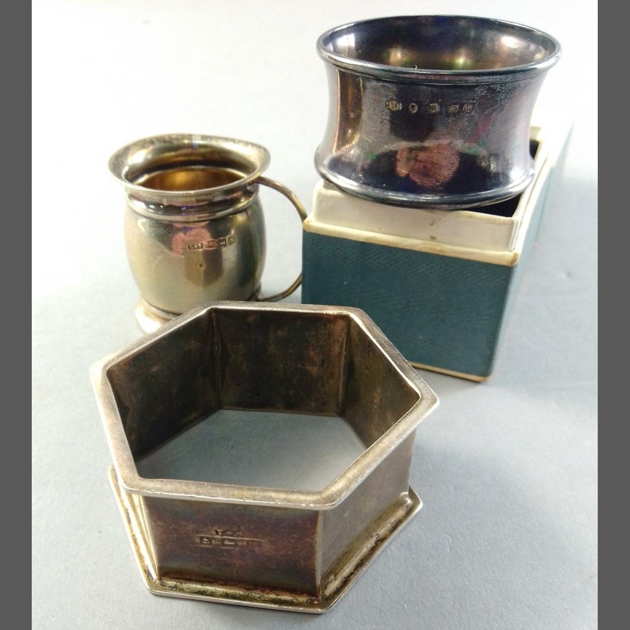 A pretty miniature tankard, 36mm high, hallmarked Birmingham 1923, weight 13.8g approx. Also two silver napkin rings, Birmingham with rubbed marks, and Birmingham 1886 combined weight 57.0g approx