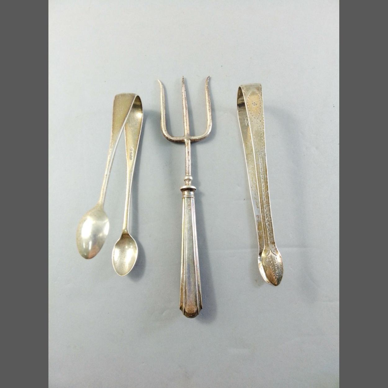 A silver pickle fork and 2 pairs of sugar nips. Weight 102g approx