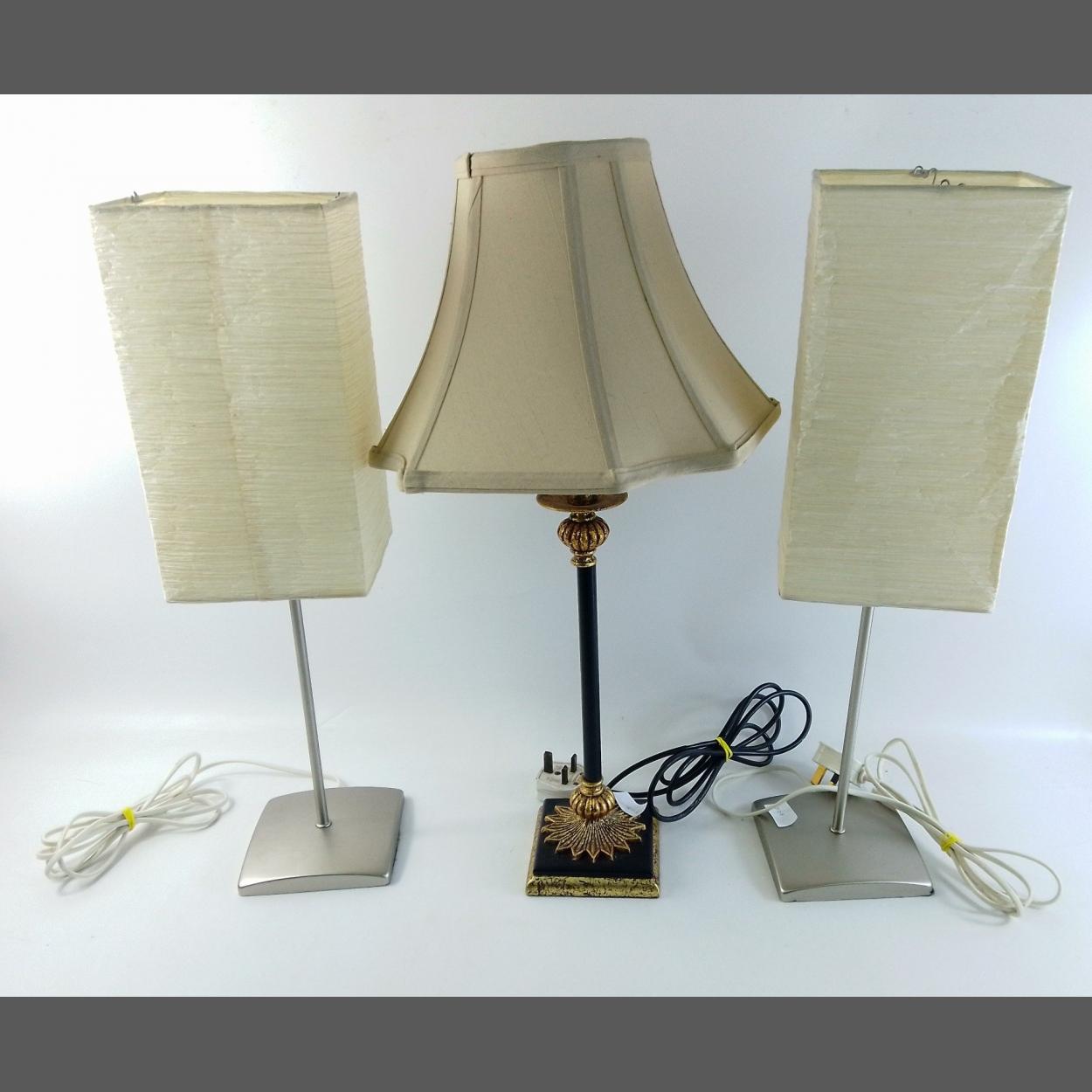 Three useful table lamps consisting of a matching pair with square shades and one more elaborate one.