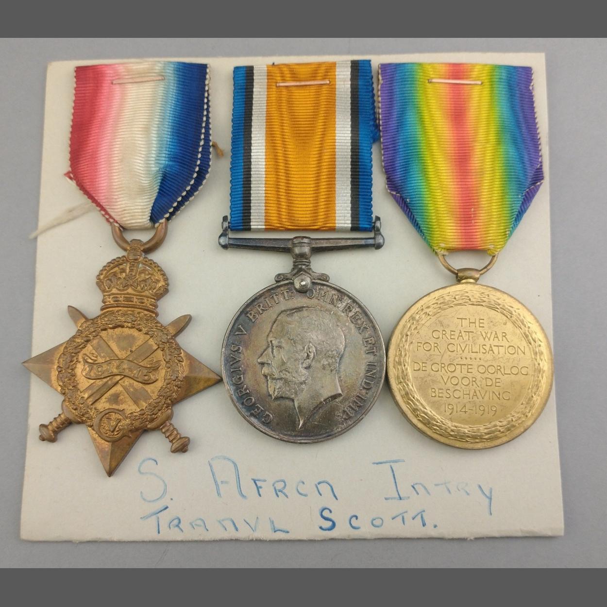 WWI medal trio - SOUTH AFRICAN INFANTRY awarded to Pte. T. McLaren comprising 1914-15 Star, British War Medal, Victory Medal with ribbons