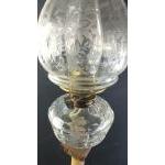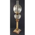 Impressive cream oynx column oil lamp with Art Deco style cast base, chimney, glass reservoir and etched glass shade. Burner marked Duplex. Height including chimney: 85cm
