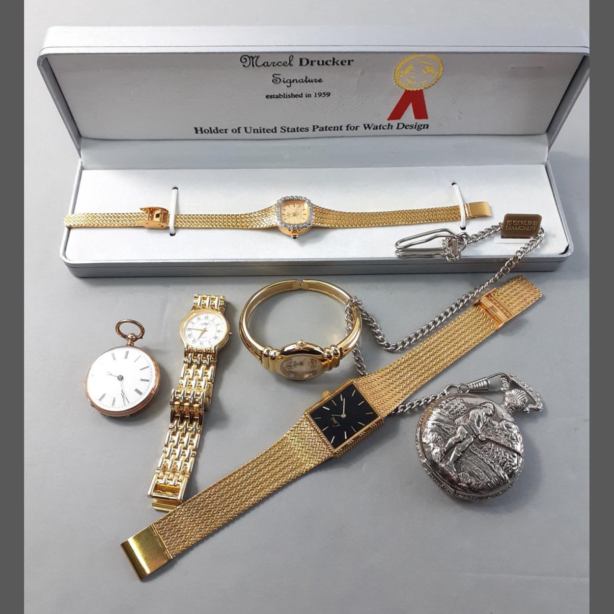 Collection of timepeices to include yellow metal pocket watch stamped k14 (shows signs as plated), Marcel Drucker wristwatch set with diamond chips, Limit watch, collectable fishing theme pocket watch etc