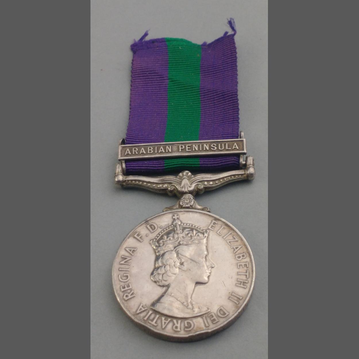 ELIZABETH II GSM General Service Medal with Arabian Peninsula clasp awarded to 23545201 Fus. N. N. Sweeney ROYAL INNISKILLINGS