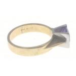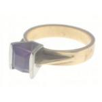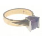 A 375 hallmarked yellow gold ring set with amethyst flanked with white gold. Stone has a slight chip. Size M and weighs 4.1g approx