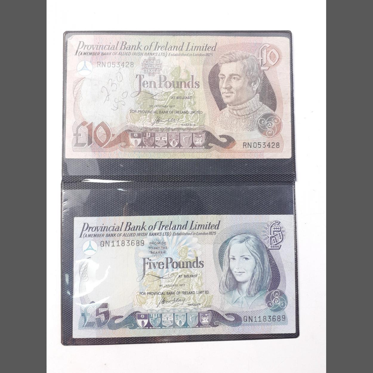 Banknotes of Irish interest to include 1977 Provincial Bank of Ireland £10 note with wear and cashier marks, 1977 QN serial number £5 note in good order