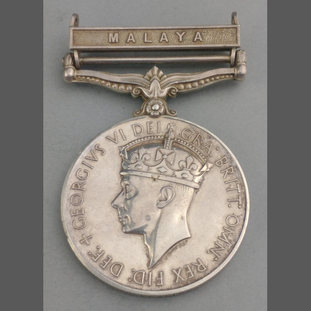GEORGE VI GSM General Service Medal with Malaya clasp awarded to 22204687 Rfn. J. S. Leslie CAMERONIANS, no ribbon