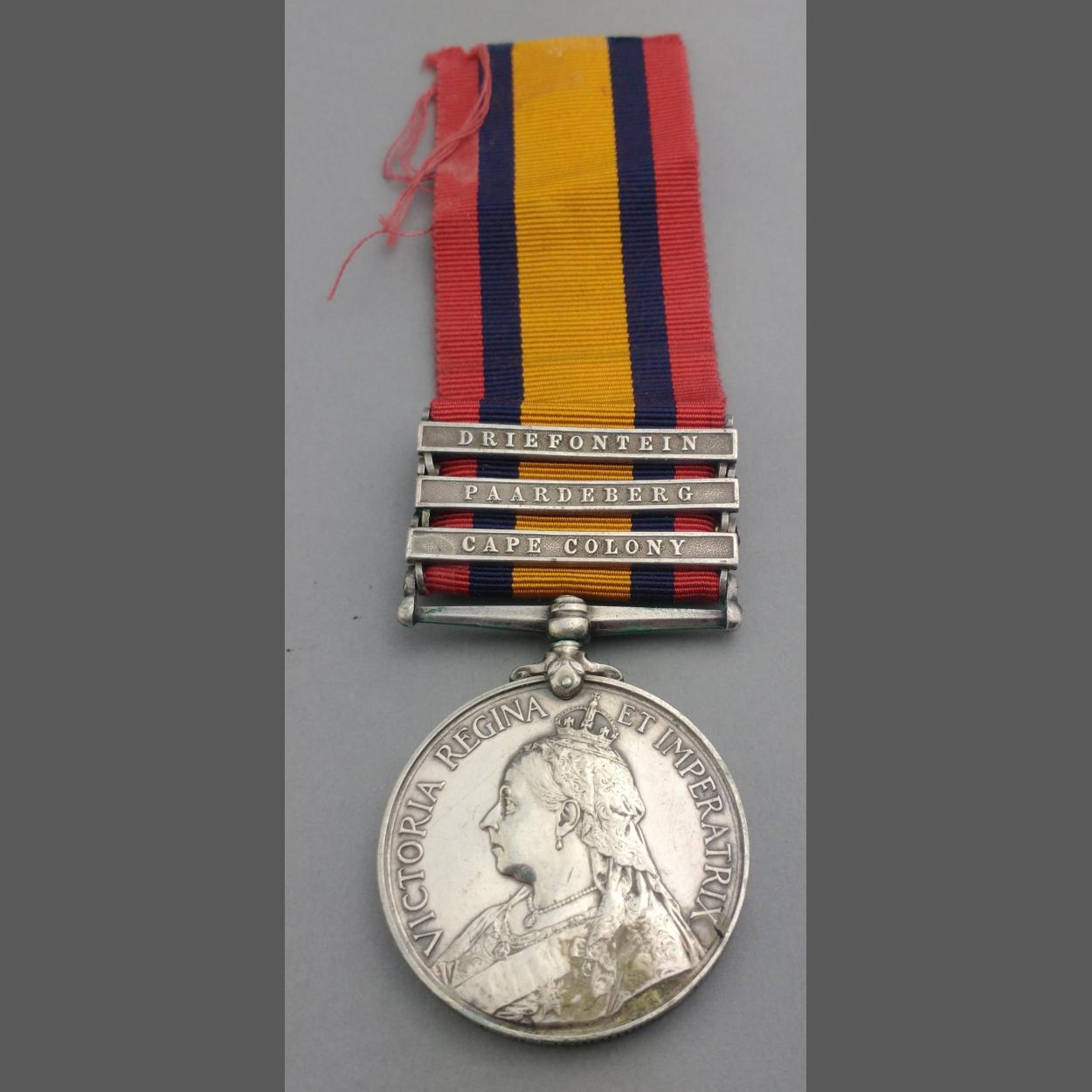VICTORIA Queen's South Africa Medal with Cape Colony, Paardeberg and Dryfontein clasps awarded to 9865 Pte F. W. Jennings RAMC