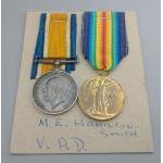 WWI medal pair VAD awarded to M.E. Hamilton-Smith