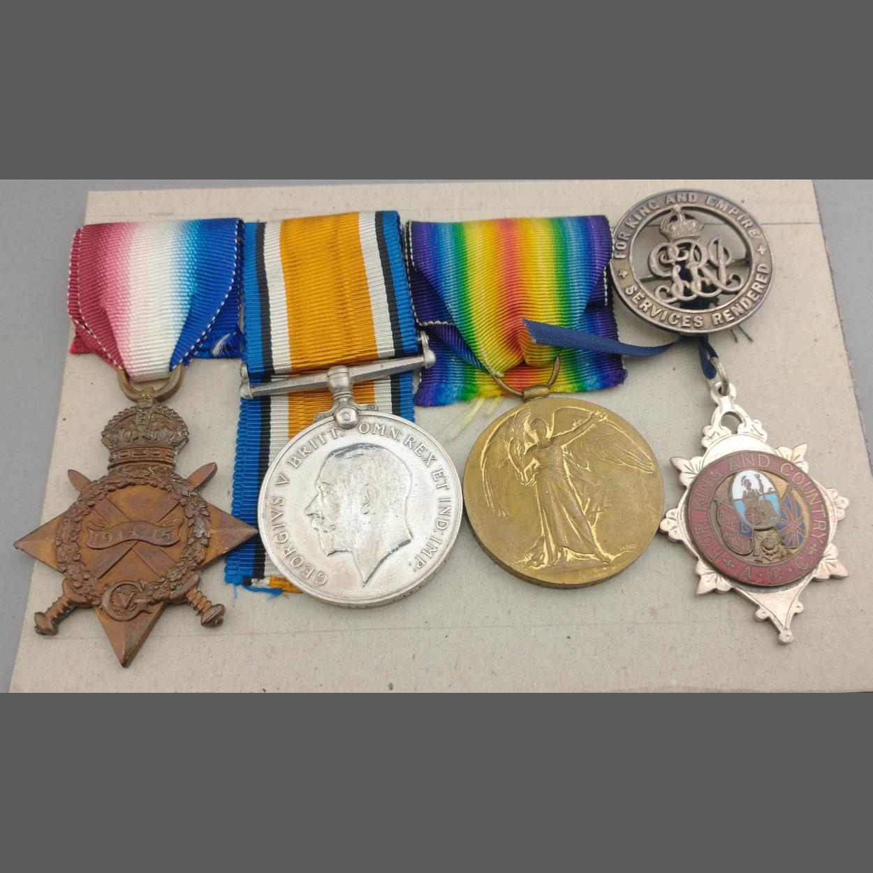 WWI medal group FIFE AND FORFAR YEOMANRY awarded to Pte. J. A. Neill comprising 1914-1915 Star, British War Medal, Victory Medal, silver war badge and a 1935 dated ACC for King and Country Stewart's pendant medal