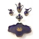 MADE IN CHILE Cobalt Blue gilded 17cm tray with four other miniature pieces to include tea pot, urn and two vases. Excellent quality pieces all complete and with no damage.