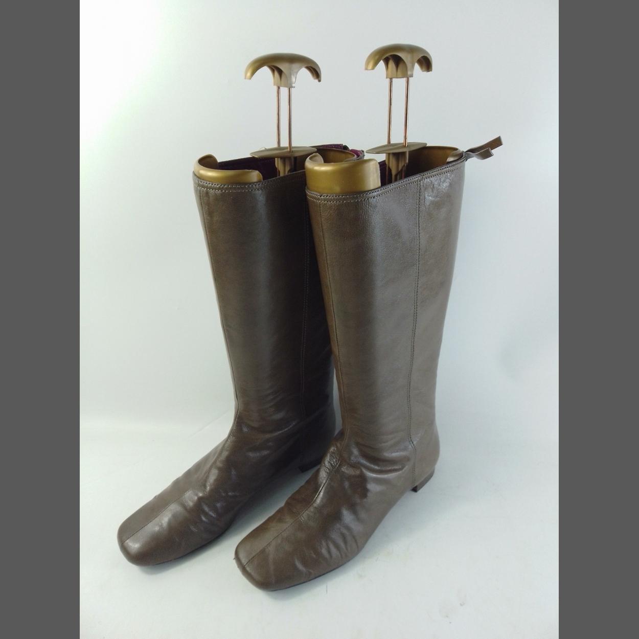 A pair of brown leather knee-high boots with full length zip to rear. Style Fionna, Size 9.5B. Wear to soles
