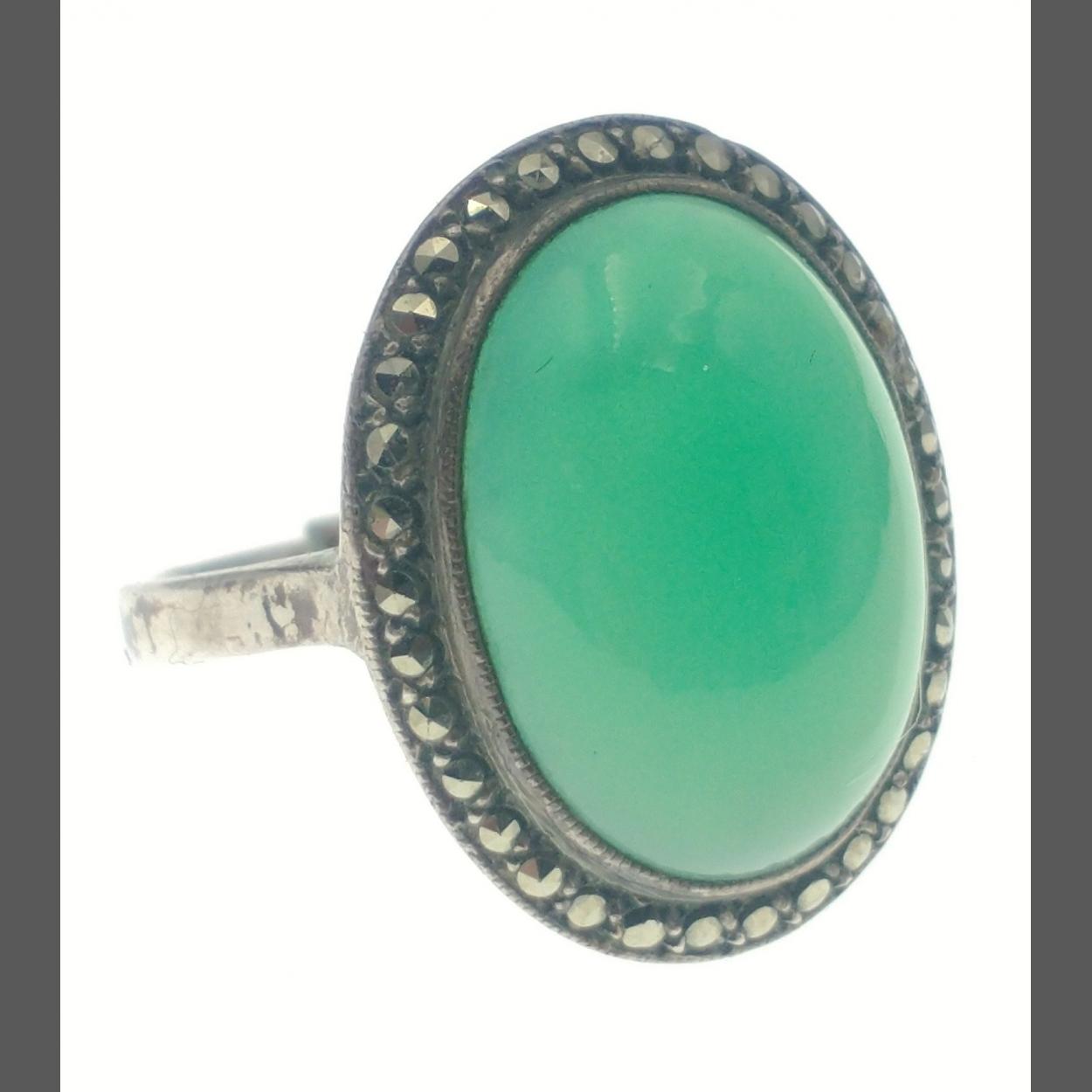 An 835 stamped silver ring with substantial green centre stone with marcasite surround. Size M, gross weight 5g approx.