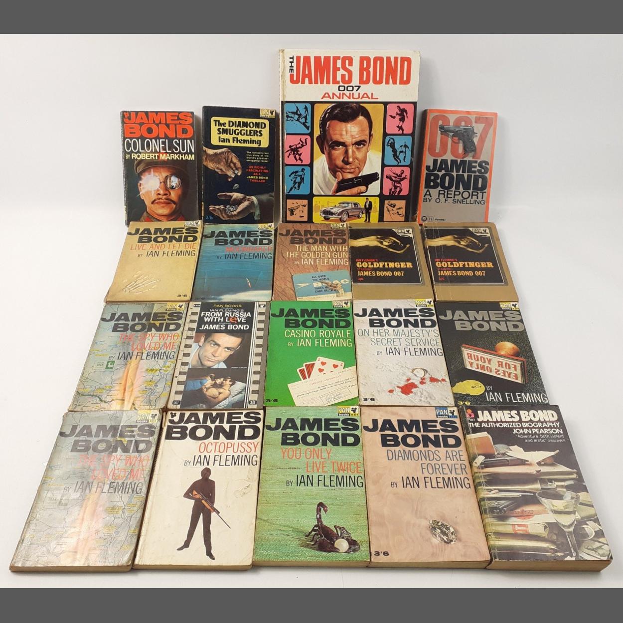 Fourteen original JAMES BOND books by Ian Fleming published by Pan, plus 4 others and one annual