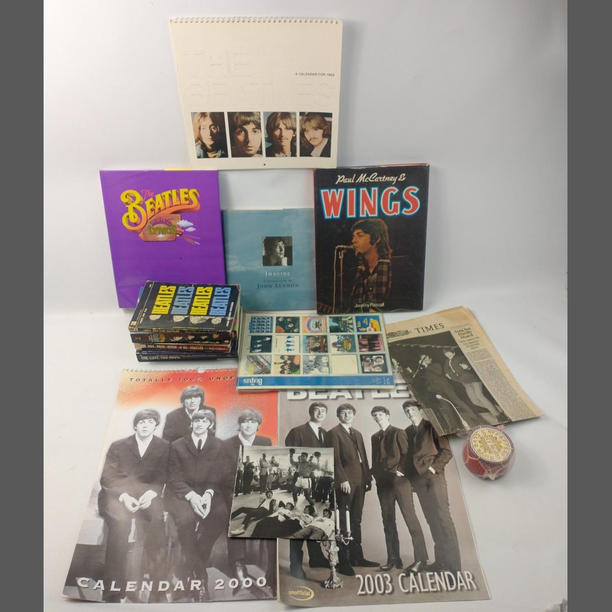 A mixed BEATLES lot of ephemera to include unofficial calendars from 2000 and 2003, a 1989 calendar, set of of official magnet covers of the 15 albums, original newspapers and several books