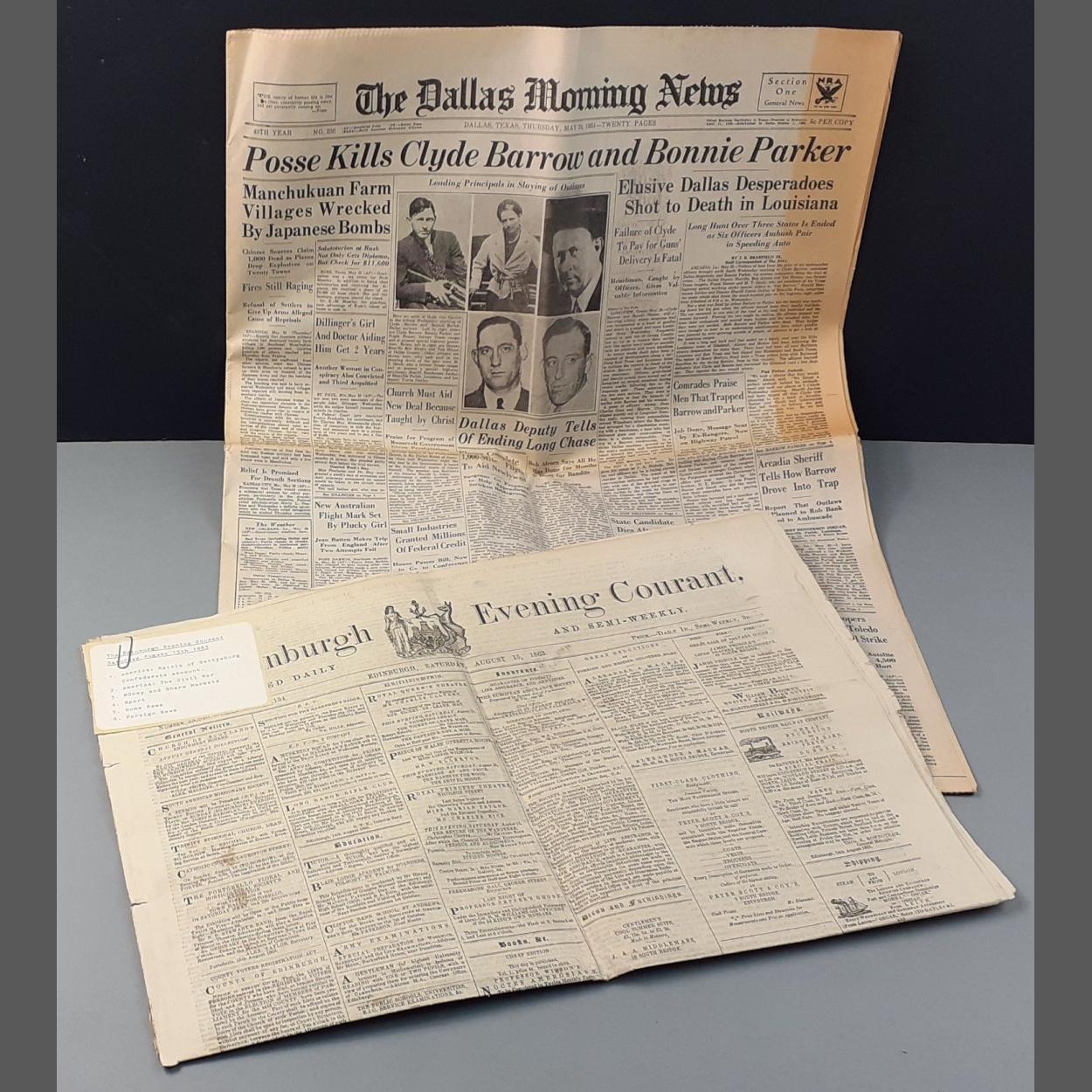 An EDINBURGH EVENING COURANT newspaper from 1863 with details from the battle of Gettysburg, plus a 1934 DALLAS MORNING NEWS~"POSSE KILLS CLYDE BARROW AND BONNIE PARKER"