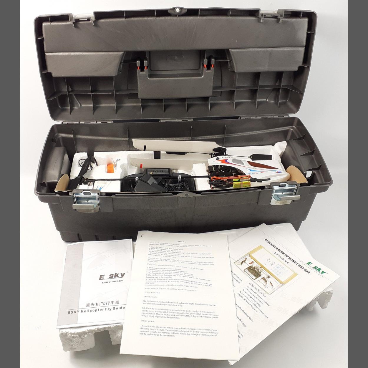 An E Sky CP2 Honeybee remote control helicopter in case with controller and accessories. Appears to be in good order, complete with instructions.