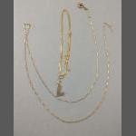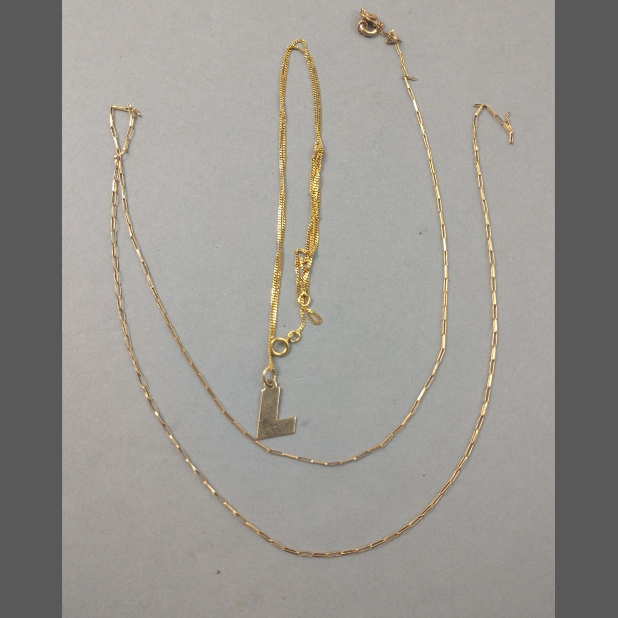 A small L-shaped gold pendant and two A/F 9ct marked chains. Total weight 2.05g approx